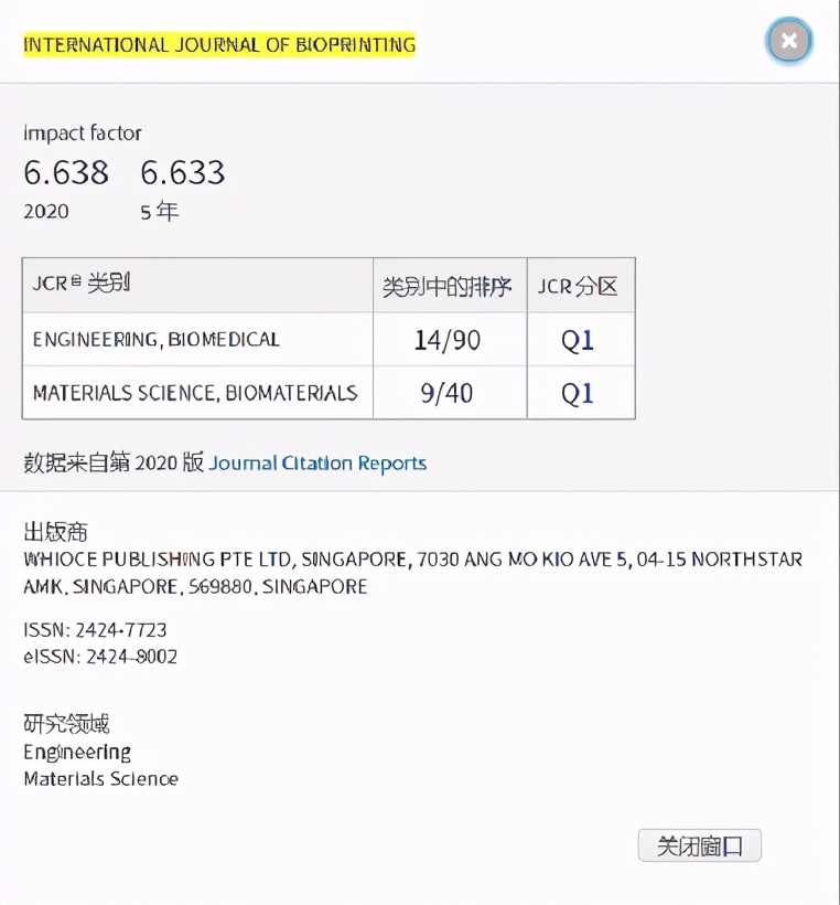 近日,科睿唯安官方发布的最新年度《期刊引证报告》(简称JCR)公布,中郁集团旗下WhiocePublishing出版社(新加坡)创办的《International Journal of Bioprinting》(以下用中文名字《国际3D生物打印》)获得了2020年JCR期刊影响因子分值高达6.638分,是全新加坡学术期刊分值最高的,在关联的两个领域均被列入Q1:在SCIE收录的Engineering, Biomedical 大类中排名第14/90位(Q1),在Materials Science, Biomaterials大类中排名9/40位(Q1)。